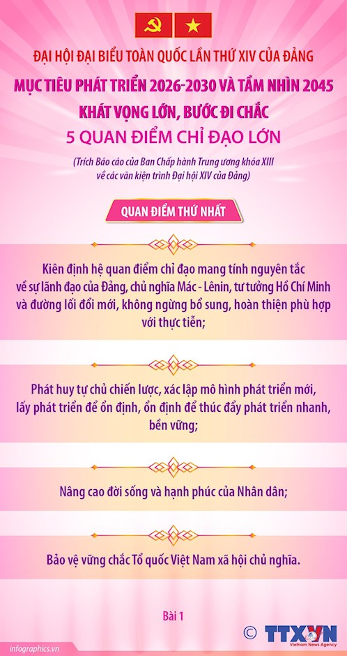 Báo cáo nêu rõ: Để thực hiện mục tiêu phát triển đất nước trong giai đoạn tới, chúng ta xác định 5 quan điểm chỉ đạo lớn; trong đó có: Kiên định hệ quan điểm chỉ đạo mang tính nguyên tắc về sự lãnh đạo của Đảng, chủ nghĩa Marx- Lenin, tư tưởng Hồ Chí Minh và đường lối đổi mới, không ngừng bổ sung, hoàn thiện phù hợp với thực tiễn; phát huy tự chủ chiến lược, xác lập mô hình phát triển mới, lấy phát triển để ổn định, ổn định để thúc đẩy phát triển nhanh, bền vững; nâng cao đời sống và hạnh phúc của Nhân dân; bảo vệ vững chắc Tổ quốc Việt Nam xã hội chủ nghĩa.